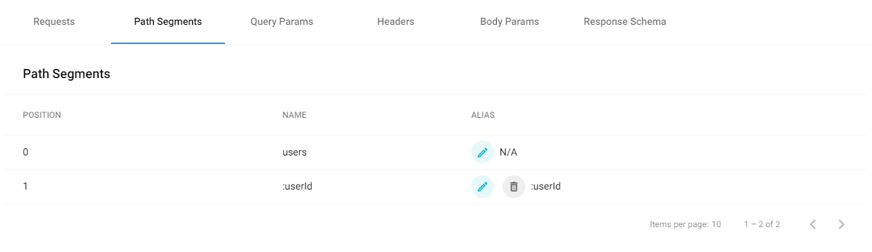 After creating an endpoint, you also have the option to configure path segment(s) as an alias. To configure an alias, select the pencil icon button underneath the **Alias** column for the desired path segment.